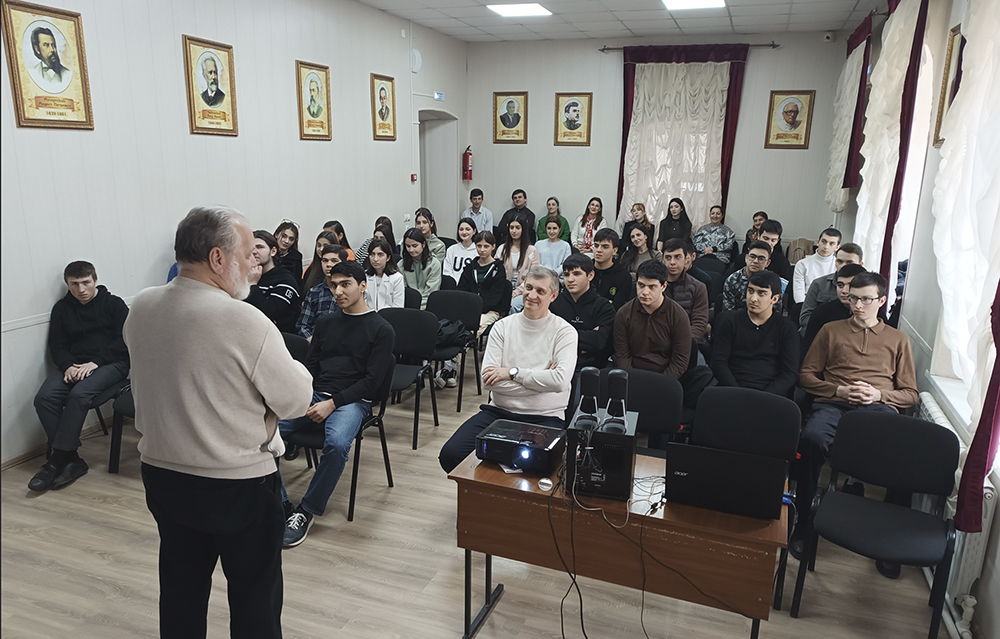 Ведущий артист Государственного республиканского русского драматического театра имени М. Горького, Народный артист РД Мещерин Владимир Георгиевич, как педагог с большим опытом работы, который вырос в Дербенте, обращаясь к воспитанникам училища поднял темы любви к профессии, к родному городу, о необходимости сегодня быть всесторонне развитыми и разбираться в информационном пространстве, и тему «Защитники Отечества», которая сегодня в приоритете и для кинематографистов.