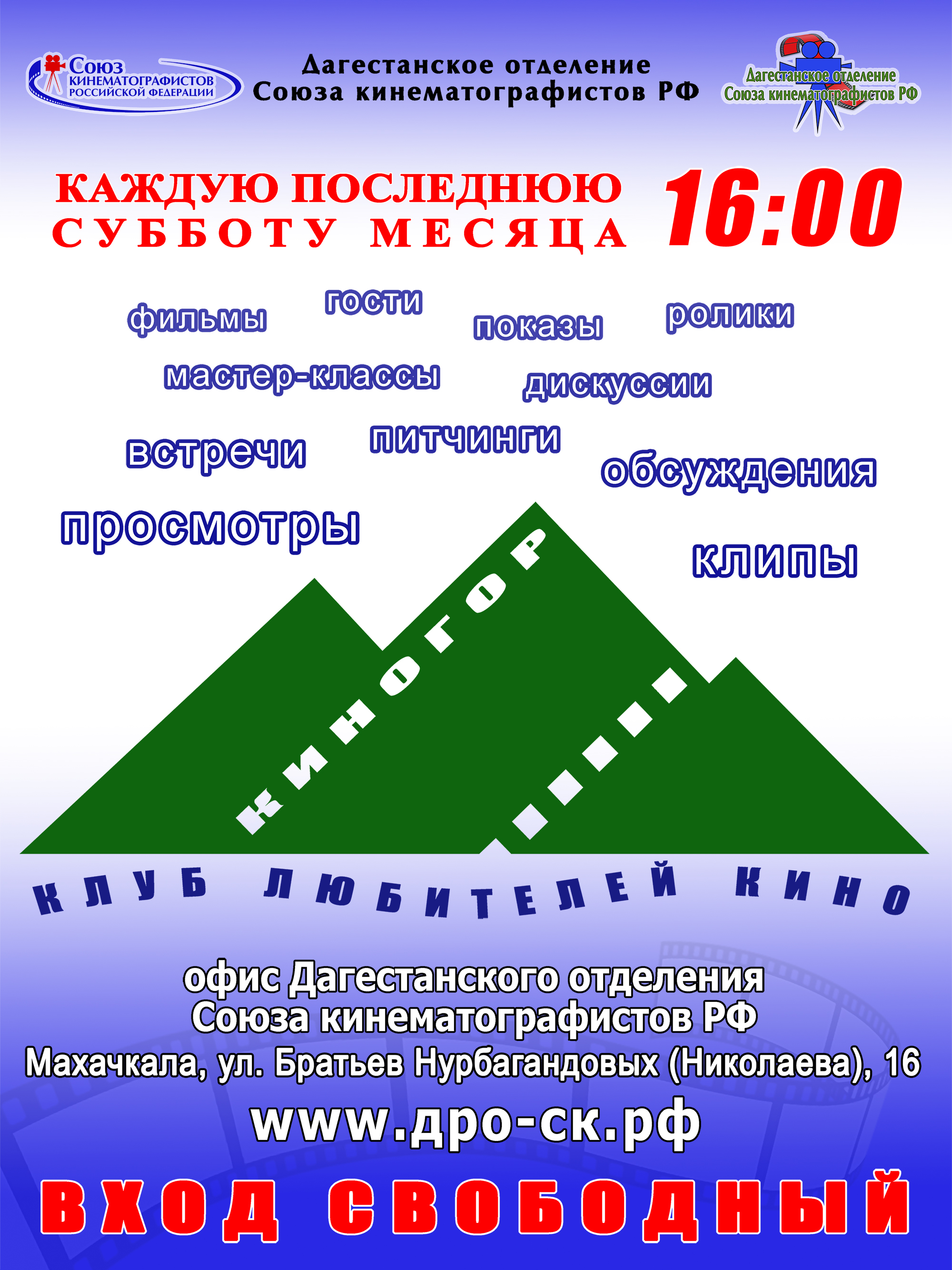Уважаемые друзья, коллеги, 26 сентября в 16:00 в офисе Дагестанского республиканского отделения Союза кинематографистов РФ, расположенного по адресу: ул. Братьев Нурбагандовых (Николаева), дом 16, состоится очередная встреча клуба КИНОГОР. Гостями клуба будут представители киностудии "My way films" Камиль Алиев и др. Это хорошая возможность задать вопрос и получить ответ, что называется - без посредников, молодым талантливым кинематографистам, завоевавшим признание зрителей, как в Дагестане, так и за его пределами.