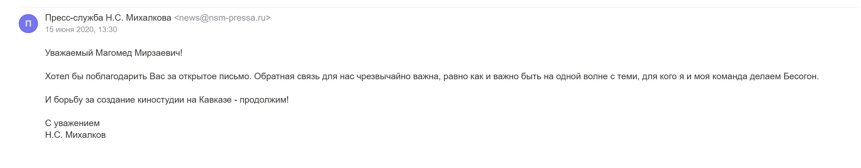 Ответ Н. С. Михалкова на открытое письмо
