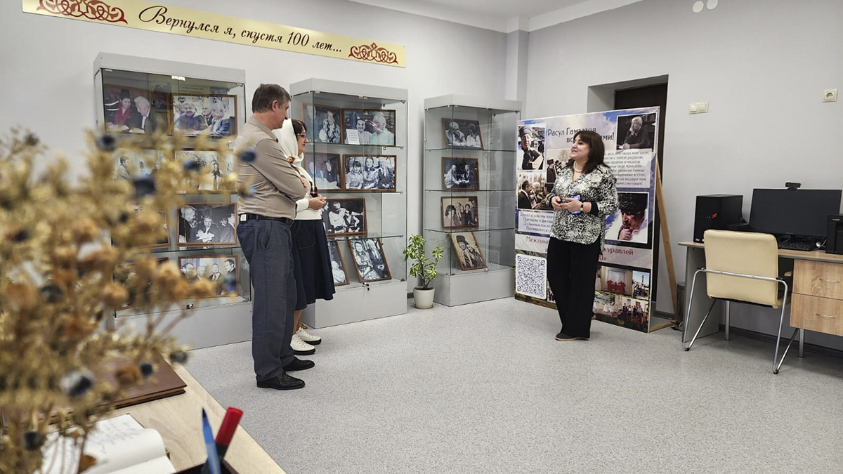 После встречи с учениками директор школы Абиева Дилара Яшаровна провела для гостей экскурсию по школьному музею Расула Гамзатова, где бережно хранятся уникальные экспонаты великого поэта, собранные не одним поколением воспитанников и педагогов этого учебного учреждения.
