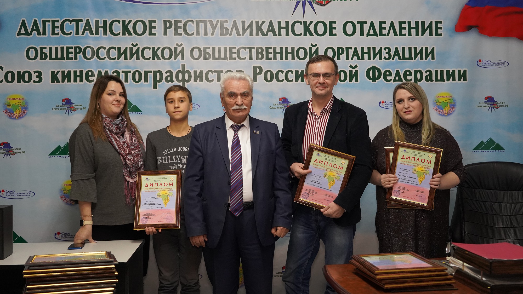 Вчера в офисе Дагестанского республиканского отделения Союза кинематографистов состоялось оглашение итогов Второго республиканского открытого кинофестиваля «Золотая лоза». Председатель отделения, он же председатель жюри Магомед Мирзаевич Сулейманов зачитал список победителей кинофестиваля, а также тех, кто удостоился поощрительных дипломов в дополнительных номинациях. Нужно сказать, что в связи с необычностью проведения самого фестиваля, а именно формата ONLINE, жюри приняло решение наградить теми или иными дипломами всех участников конкурса. И Магомед Сулейманов от лица организаторов поздравил дипломантов, поблагодарил и пожелал крепкого здоровья всем, кто принимал участие в кинофестивале, а также пообещал, что все дипломы дойдут до своих адресатов. Те же из конкурсантов, кто смогли и присутствовали на выступлении, получили награды лично. Запись выступления и все конкурсные работы можно посмотреть до 31 декабря этого года на официальном YouTube-канале Кинофестиваля «Золотая лоза» по ссылке: https://www.youtube.com/channel/UCGT0kSuSrL__OAXS9MR14QQ/videos